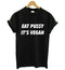 A cotton t-shirt, featuring "Eat Pu$$y, Not Animals" on the front. Great for casual wear.